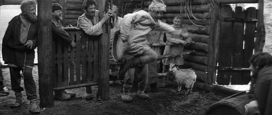 卢布廖夫一行人走在草垛间,正当几人赞叹着白桦树的生命力时,突然天降大雨,他们不得不躲到农民的屋舍中。随即,他们见识到因为连绵的大雨,农民无法投入种植,生产活动被迫停止,此为“天灾”。在屋舍中,流浪艺人尽情表演着他的才艺,以哗众取宠的方式来博取生计,男人们占据着生产权,妇女与孩子们被排斥在屋舍外,只能遭受天灾的突袭。卢布廖夫一行人进屋后,场面恢复了平静,不久过后,流浪艺人被军人们发现,随即惨遭暴力的折磨。这一切的背后,都是因为当时社会频繁爆发的战争,此为“人祸”。对于普通人民来讲,无论是“天灾”,还是“人祸”,都不是他们能决定的,灾难的来源是命运,影片在这种基调下展开了一系列故事。