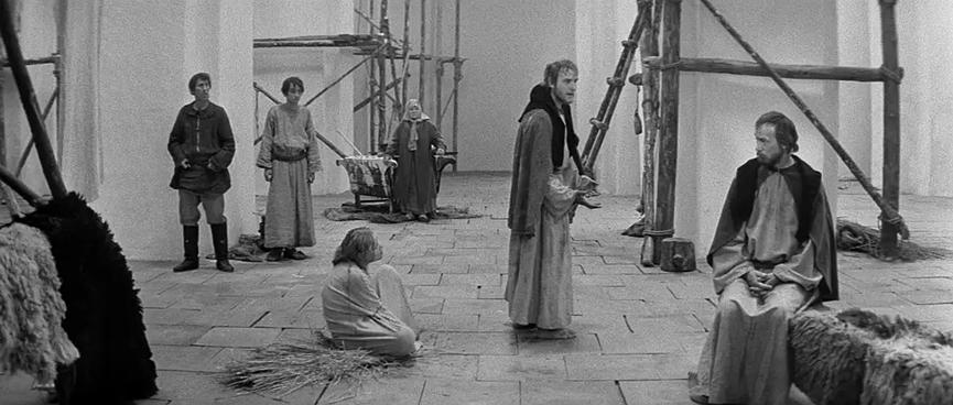 《安德烈·卢布廖夫》是塔可夫斯基作品中相对枯燥、无聊的一部,可能很多人提及塔可夫斯基就是他对以俄罗斯东正教为代表的宗教的虔诚信仰,实则不然,塔可夫斯基绝对不是耶稣一般的艺术基督,他是向固有教条发起反叛的现代教士,以其艺术创作重构信仰体系,以生而注定的使命感救赎现代人的精神世界。《卢布廖夫》也不是一部如祈祷仪式一样神圣的宗教电影,它带有深深扎根于人民、大地与自然的朴素情感,并以之为根基构建起只属于其本人的电影艺术信仰——“雕刻时光”,这些才构成了整部电影想表达的“命定的背叛”(所以我认为观看这部电影不需要过多的宗教学知识,只需要掌握对宗教教条的常识性认识即可)。
