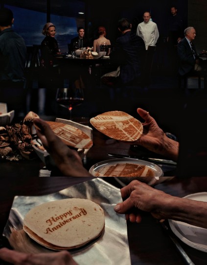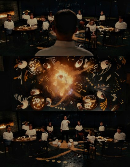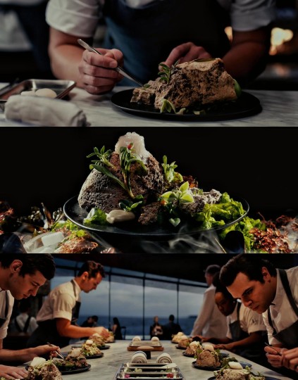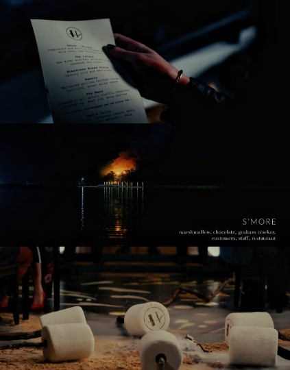 12.最后一道菜:“光盘行动”棉花糖脆饼——棉花糖、巧克力、消化饼、顾客、员工、餐厅。 (“史上对人类味觉的最大攻击,来源不道德的巧克力与胶化糖水,囚禁在工业级消化饼干之间,它代表我们的过错,我们却将它与纯真连结,童年,父母,但使这怪物改变的是火”)