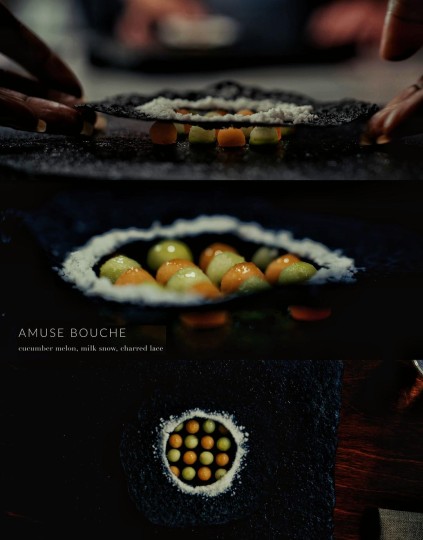 3.第一道菜:“岛屿”——盘中有岛上周围的植物,上面覆盖几近结冻的过滤海水,海水融化后将为食材调味。 (体会大自然与生态,永恒,接纳,放下。喜欢主厨说的那句“这房间里发生的事,相较于发生在大自然土壤、水中与空气里的事,毫无意义可言,我们不过是惊慌的一瞬间,大自然才是永恒。”)